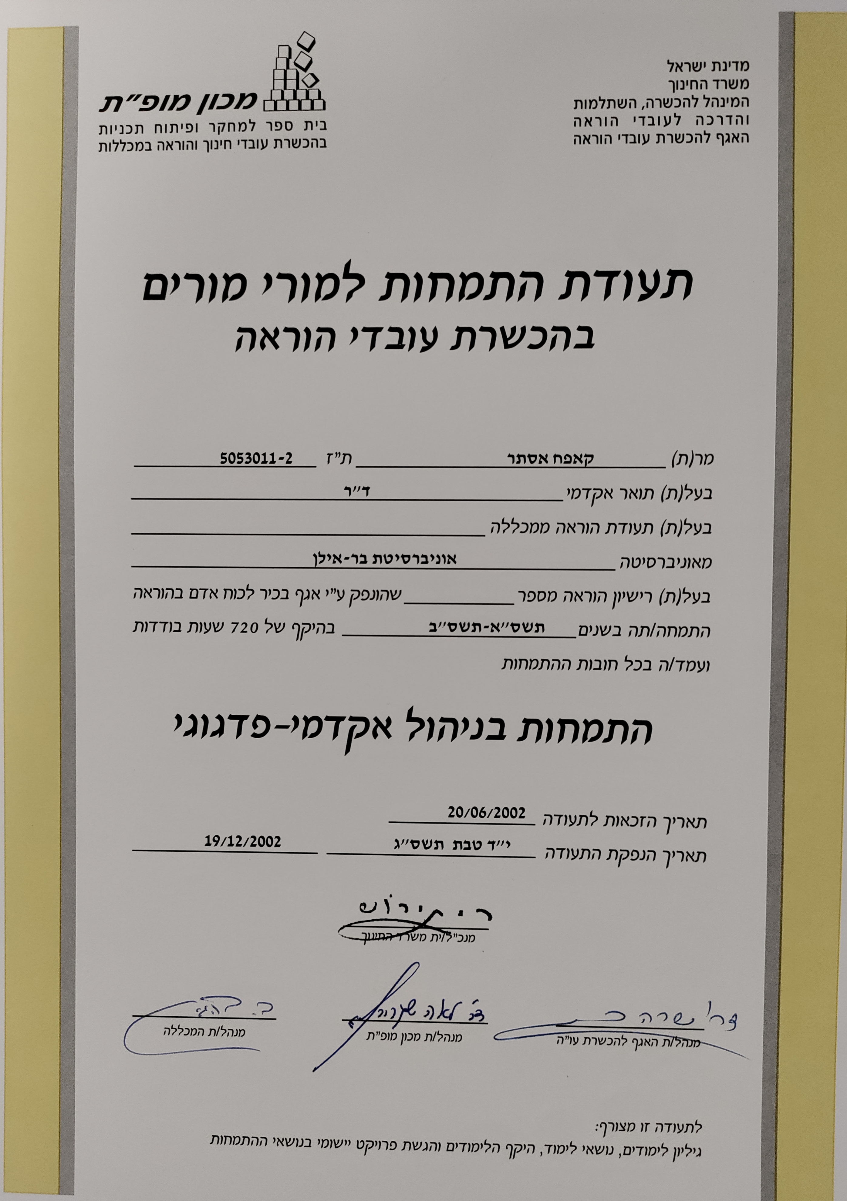 כברת דרך ארוכה עשיתי במהלך ההתמחות הפרופסיונאלית שלי על מנת ליעל את עבודתי החינוכית ולהביא את המיטב שבמיטב למתכשרים להוראה במערכת החינוך. הדוגמאות המוצגות להלן יעידו על כך.